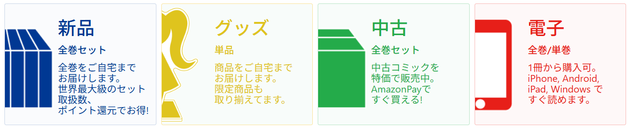 ・人気作品を全巻まとめて購入できるから探す手間なし・新品・中古どちらも選べてお得・最短翌日配送で早く読める・電子書籍も対応でスマホやタブレットでも楽しめる・購入でポイントが貯まって次回利用もお得・当店限定BOX/特典付き商品・無料試読・サイン本など限定商品の先行注文ができちゃう